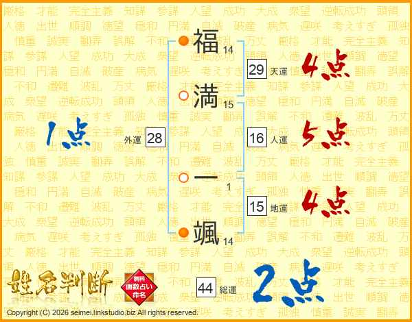生活面を象徴する運勢です。外部から受ける影響力を表し、結婚運、家庭運や職場、環境への順応性を表します。総運から人運を引いた画数。姓や名が1文字の場合を除く。