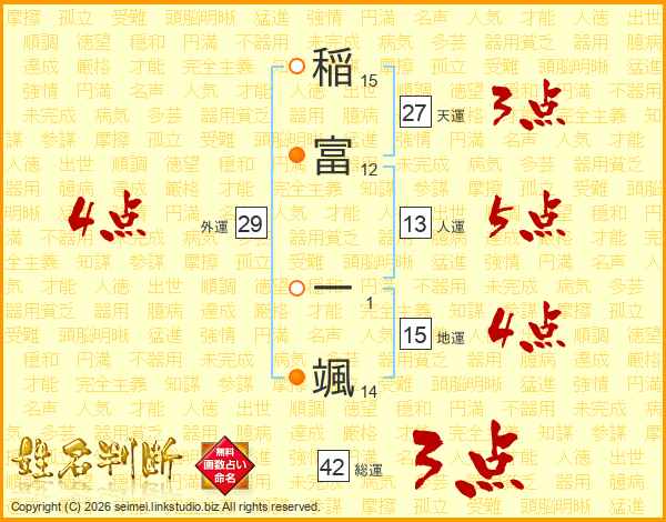 稲(15画)富(12画) 一(1画)颯(14画)