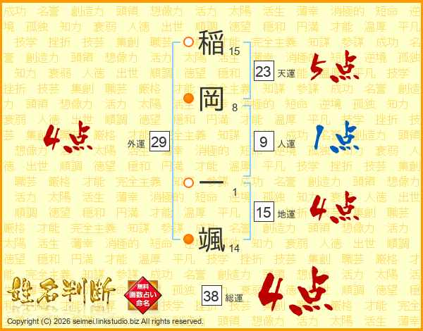 稲(15画)岡(8画) 一(1画)颯(14画)
