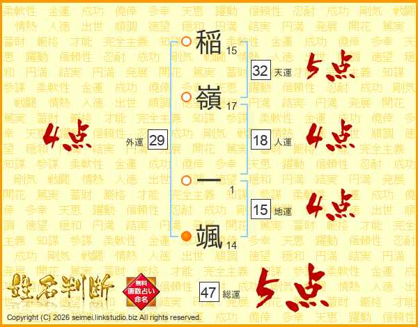 稲(15画)嶺(17画) 一(1画)颯(14画)