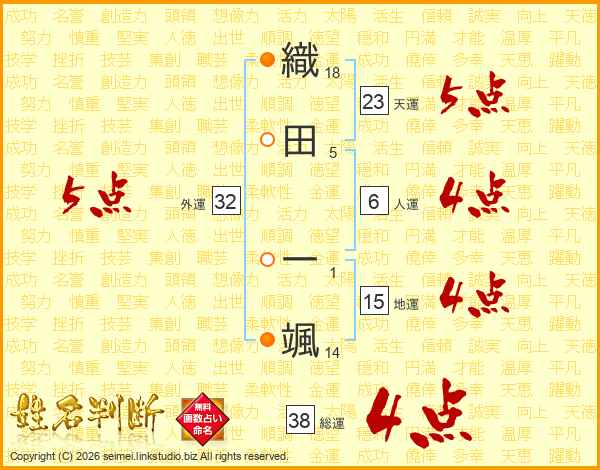 家系が持つ宿命的な運勢を表します。祖先から受け継いだ苗字ですので自分の力が及びません。家柄を象徴します。苗字の合計画数。