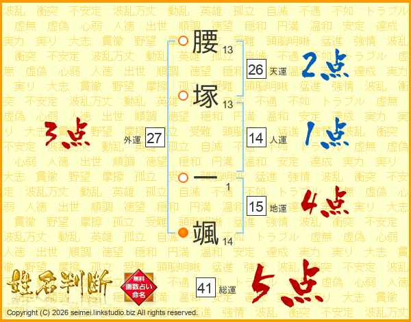 腰(13画)塚(13画) 一(1画)颯(14画)