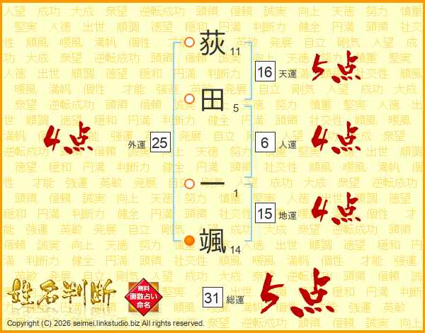 生活面を象徴する運勢です。外部から受ける影響力を表し、結婚運、家庭運や職場、環境への順応性を表します。総運から人運を引いた画数。姓や名が1文字の場合を除く。