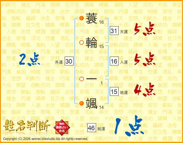 蓑(16画)輪(15画) 一(1画)颯(14画)