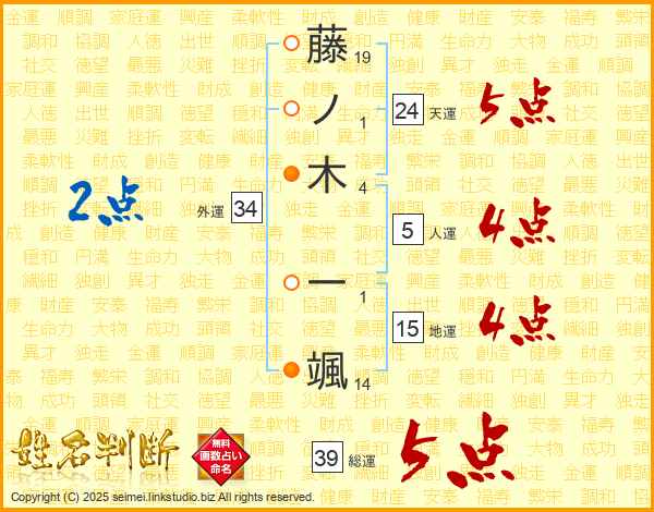藤(19画)ノ(1画)木(4画) 一(1画)颯(14画)