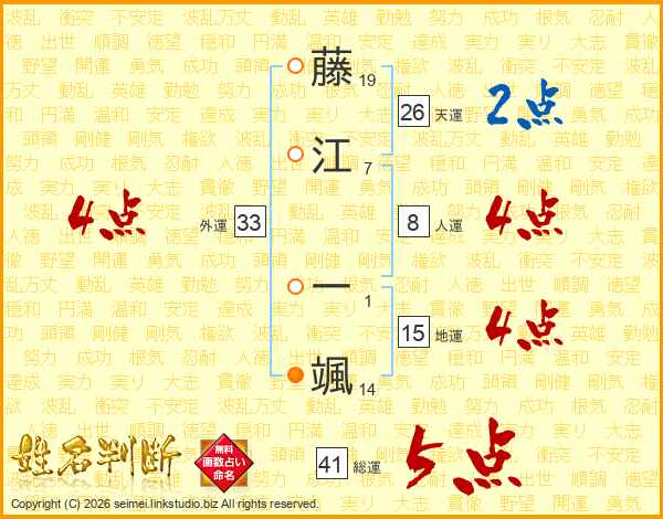生活面を象徴する運勢です。外部から受ける影響力を表し、結婚運、家庭運や職場、環境への順応性を表します。総運から人運を引いた画数。姓や名が1文字の場合を除く。