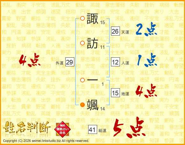 諏(15画)訪(11画) 一(1画)颯(14画)