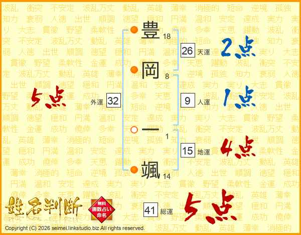 豊(18画)岡(8画) 一(1画)颯(14画)