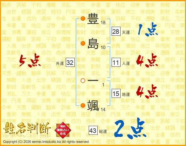 豊(18画)島(10画) 一(1画)颯(14画)