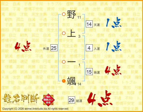 生活面を象徴する運勢です。外部から受ける影響力を表し、結婚運、家庭運や職場、環境への順応性を表します。総運から人運を引いた画数。姓や名が1文字の場合を除く。