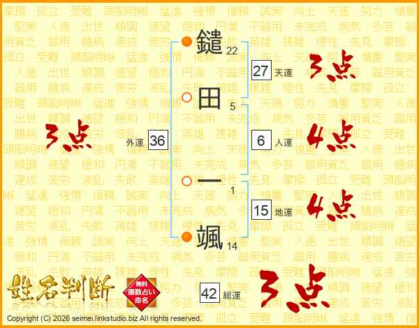 生活面を象徴する運勢です。外部から受ける影響力を表し、結婚運、家庭運や職場、環境への順応性を表します。総運から人運を引いた画数。姓や名が1文字の場合を除く。