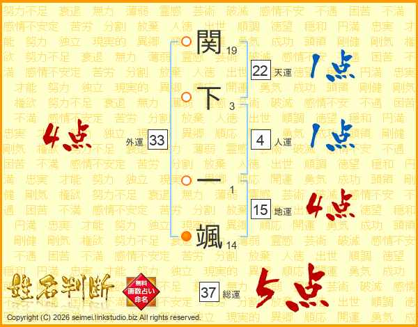 生活面を象徴する運勢です。外部から受ける影響力を表し、結婚運、家庭運や職場、環境への順応性を表します。総運から人運を引いた画数。姓や名が1文字の場合を除く。
