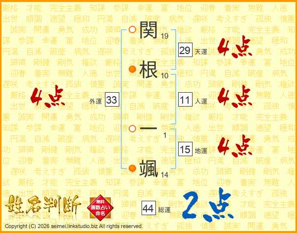 生活面を象徴する運勢です。外部から受ける影響力を表し、結婚運、家庭運や職場、環境への順応性を表します。総運から人運を引いた画数。姓や名が1文字の場合を除く。