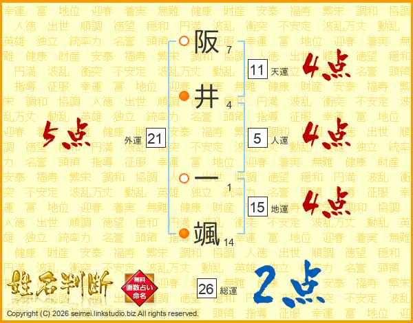 生活面を象徴する運勢です。外部から受ける影響力を表し、結婚運、家庭運や職場、環境への順応性を表します。総運から人運を引いた画数。姓や名が1文字の場合を除く。