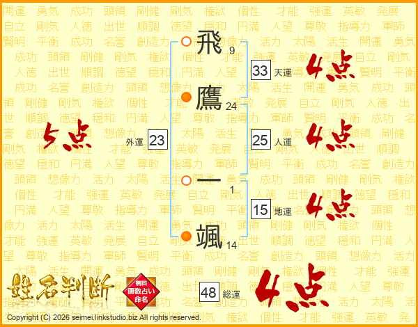 飛(9画)鷹(24画) 一(1画)颯(14画)