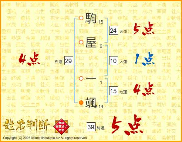 駒屋一颯さんの総運は39画の5点!