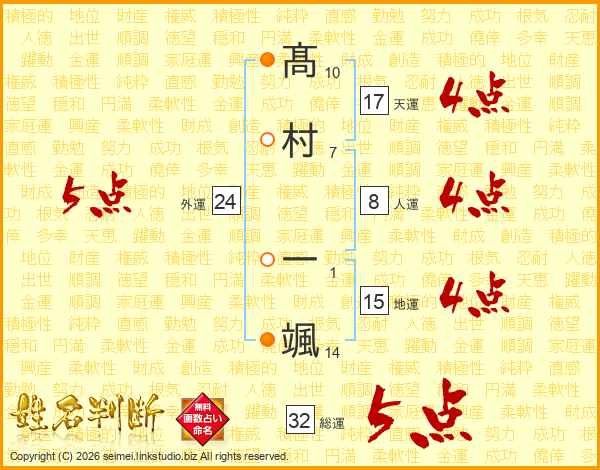 生活面を象徴する運勢です。外部から受ける影響力を表し、結婚運、家庭運や職場、環境への順応性を表します。総運から人運を引いた画数。姓や名が1文字の場合を除く。