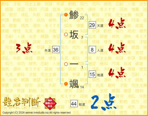 鯵坂一颯さんの総運は44画の2点!