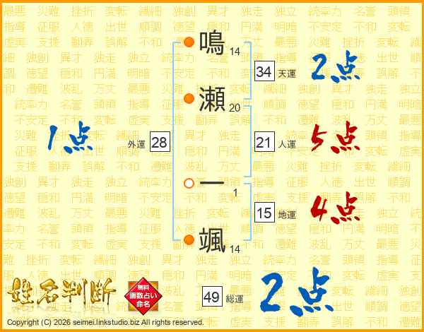 鳴瀬一颯さんの総運は49画の2点!