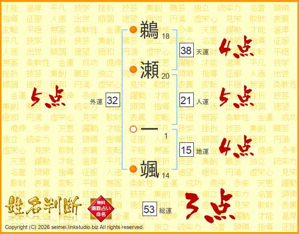 生活面を象徴する運勢です。外部から受ける影響力を表し、結婚運、家庭運や職場、環境への順応性を表します。総運から人運を引いた画数。姓や名が1文字の場合を除く。