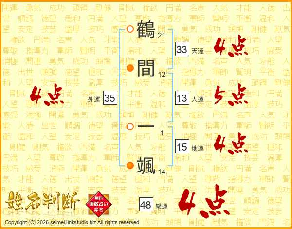 鶴(21画)間(12画) 一(1画)颯(14画)