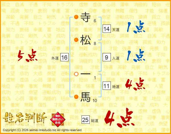 生活面を象徴する運勢です。外部から受ける影響力を表し、結婚運、家庭運や職場、環境への順応性を表します。総運から人運を引いた画数。姓や名が1文字の場合を除く。