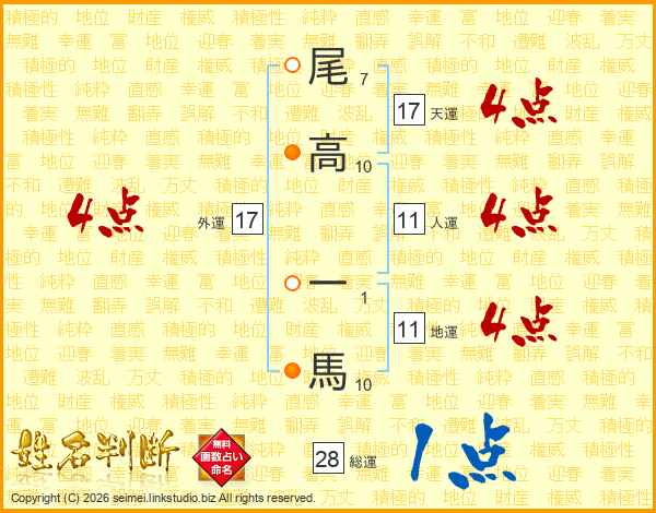 生活面を象徴する運勢です。外部から受ける影響力を表し、結婚運、家庭運や職場、環境への順応性を表します。総運から人運を引いた画数。姓や名が1文字の場合を除く。
