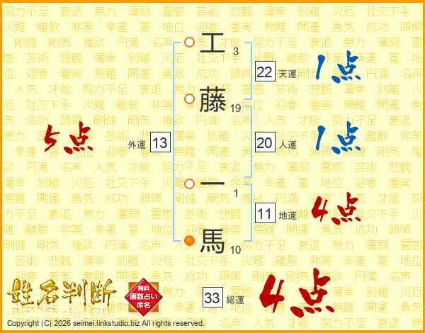 生活面を象徴する運勢です。外部から受ける影響力を表し、結婚運、家庭運や職場、環境への順応性を表します。総運から人運を引いた画数。姓や名が1文字の場合を除く。