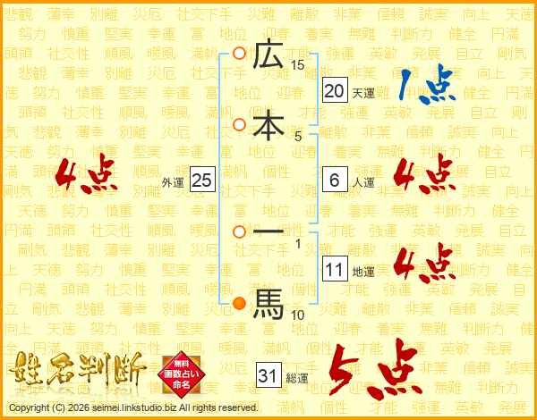 広本一馬さんの総運は31画の5点!