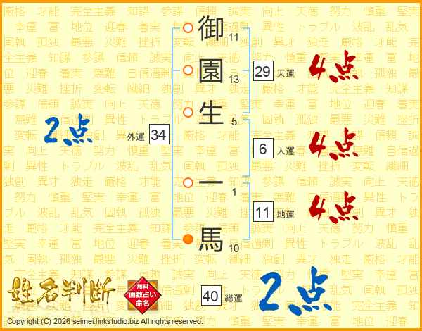 御(11画)園(13画)生(5画) 一(1画)馬(10画)