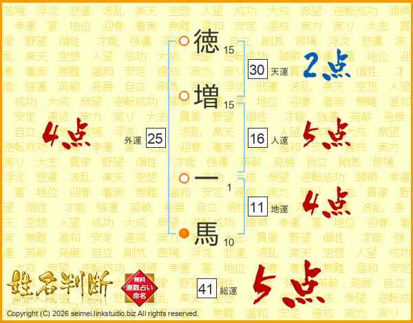 生活面を象徴する運勢です。外部から受ける影響力を表し、結婚運、家庭運や職場、環境への順応性を表します。総運から人運を引いた画数。姓や名が1文字の場合を除く。