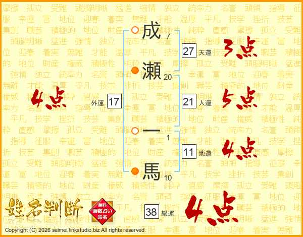 成(7画)瀬(20画) 一(1画)馬(10画)