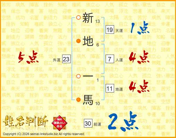 生活面を象徴する運勢です。外部から受ける影響力を表し、結婚運、家庭運や職場、環境への順応性を表します。総運から人運を引いた画数。姓や名が1文字の場合を除く。