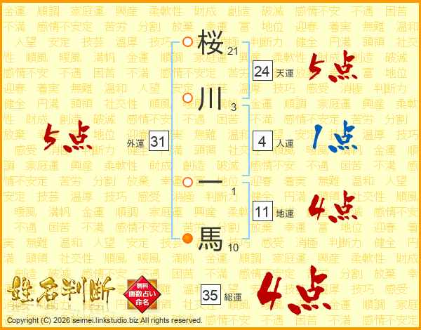 桜川一馬さんの総運は35画の4点!