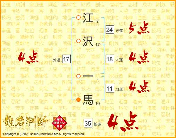 生活面を象徴する運勢です。外部から受ける影響力を表し、結婚運、家庭運や職場、環境への順応性を表します。総運から人運を引いた画数。姓や名が1文字の場合を除く。