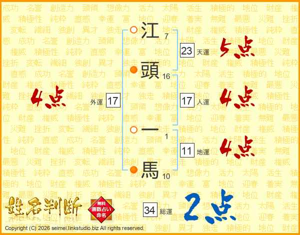家系が持つ宿命的な運勢を表します。祖先から受け継いだ苗字ですので自分の力が及びません。家柄を象徴します。苗字の合計画数。