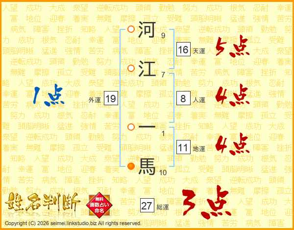 生活面を象徴する運勢です。外部から受ける影響力を表し、結婚運、家庭運や職場、環境への順応性を表します。総運から人運を引いた画数。姓や名が1文字の場合を除く。