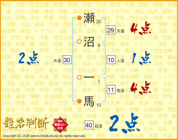 瀬沼一馬さんの総運は40画の2点!