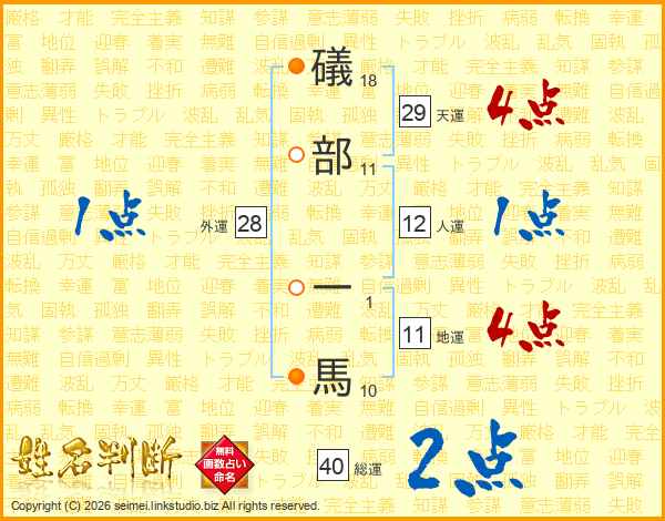 生活面を象徴する運勢です。外部から受ける影響力を表し、結婚運、家庭運や職場、環境への順応性を表します。総運から人運を引いた画数。姓や名が1文字の場合を除く。
