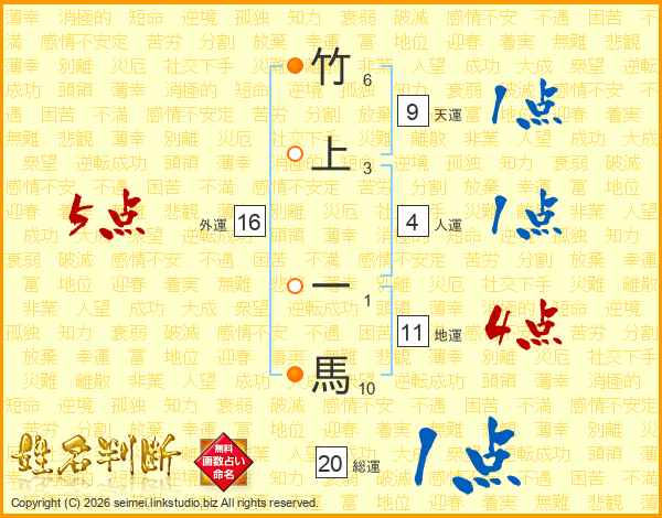 生活面を象徴する運勢です。外部から受ける影響力を表し、結婚運、家庭運や職場、環境への順応性を表します。総運から人運を引いた画数。姓や名が1文字の場合を除く。