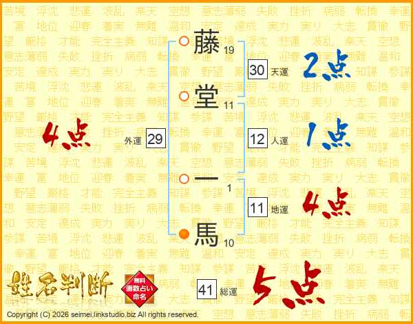 藤(19画)堂(11画) 一(1画)馬(10画)