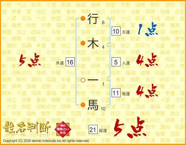 あなたの人生を表す1番重要な運勢です。生涯を通じて影響する総合運となり、主に50歳以降の晩年期に影響を及ぼします。苗字と名前の合計画数。
