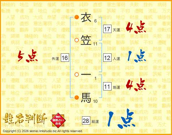 衣(6画)笠(11画) 一(1画)馬(10画)