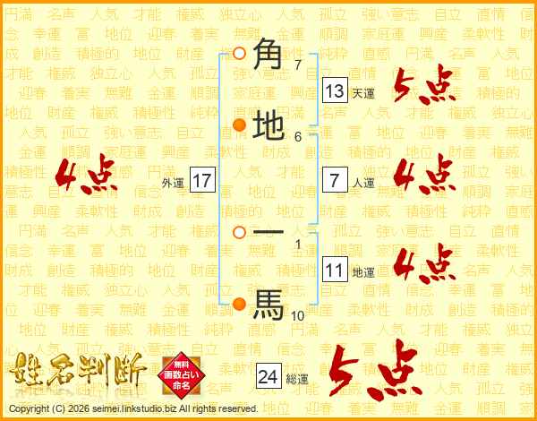 生活面を象徴する運勢です。外部から受ける影響力を表し、結婚運、家庭運や職場、環境への順応性を表します。総運から人運を引いた画数。姓や名が1文字の場合を除く。