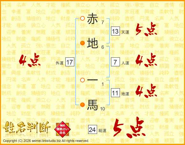 生活面を象徴する運勢です。外部から受ける影響力を表し、結婚運、家庭運や職場、環境への順応性を表します。総運から人運を引いた画数。姓や名が1文字の場合を除く。