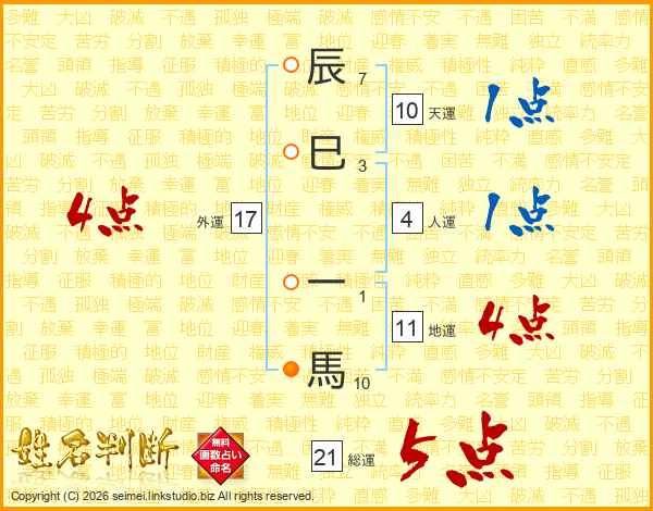 辰巳一馬さんの総運は21画の5点!