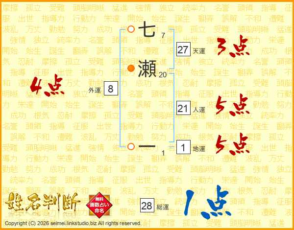 生活面を象徴する運勢です。外部から受ける影響力を表し、結婚運、家庭運や職場、環境への順応性を表します。総運から人運を引いた画数。姓や名が1文字の場合を除く。