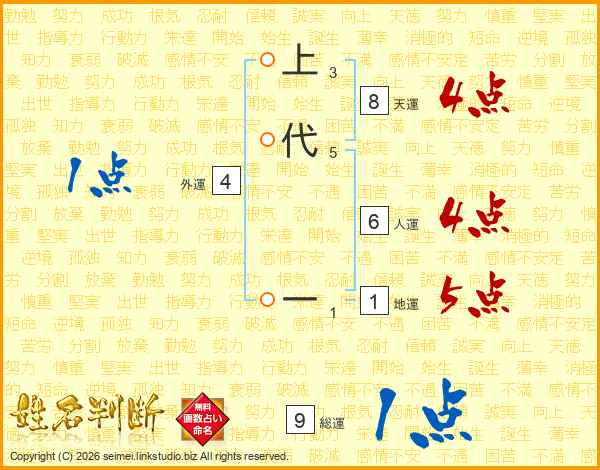 生活面を象徴する運勢です。外部から受ける影響力を表し、結婚運、家庭運や職場、環境への順応性を表します。総運から人運を引いた画数。姓や名が1文字の場合を除く。