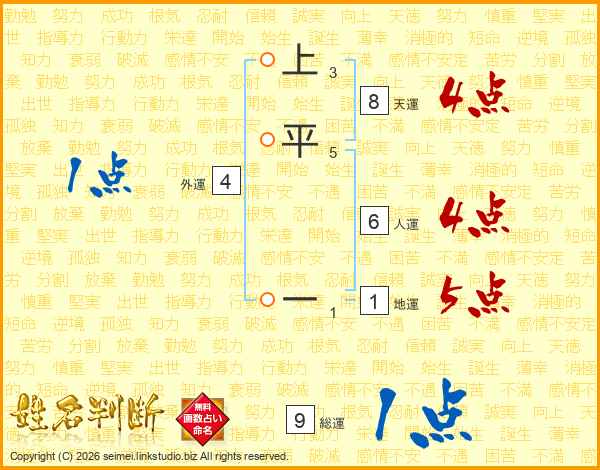 生活面を象徴する運勢です。外部から受ける影響力を表し、結婚運、家庭運や職場、環境への順応性を表します。総運から人運を引いた画数。姓や名が1文字の場合を除く。