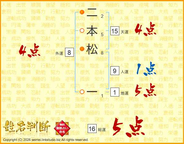 あなたの人生を表す1番重要な運勢です。生涯を通じて影響する総合運となり、主に50歳以降の晩年期に影響を及ぼします。苗字と名前の合計画数。